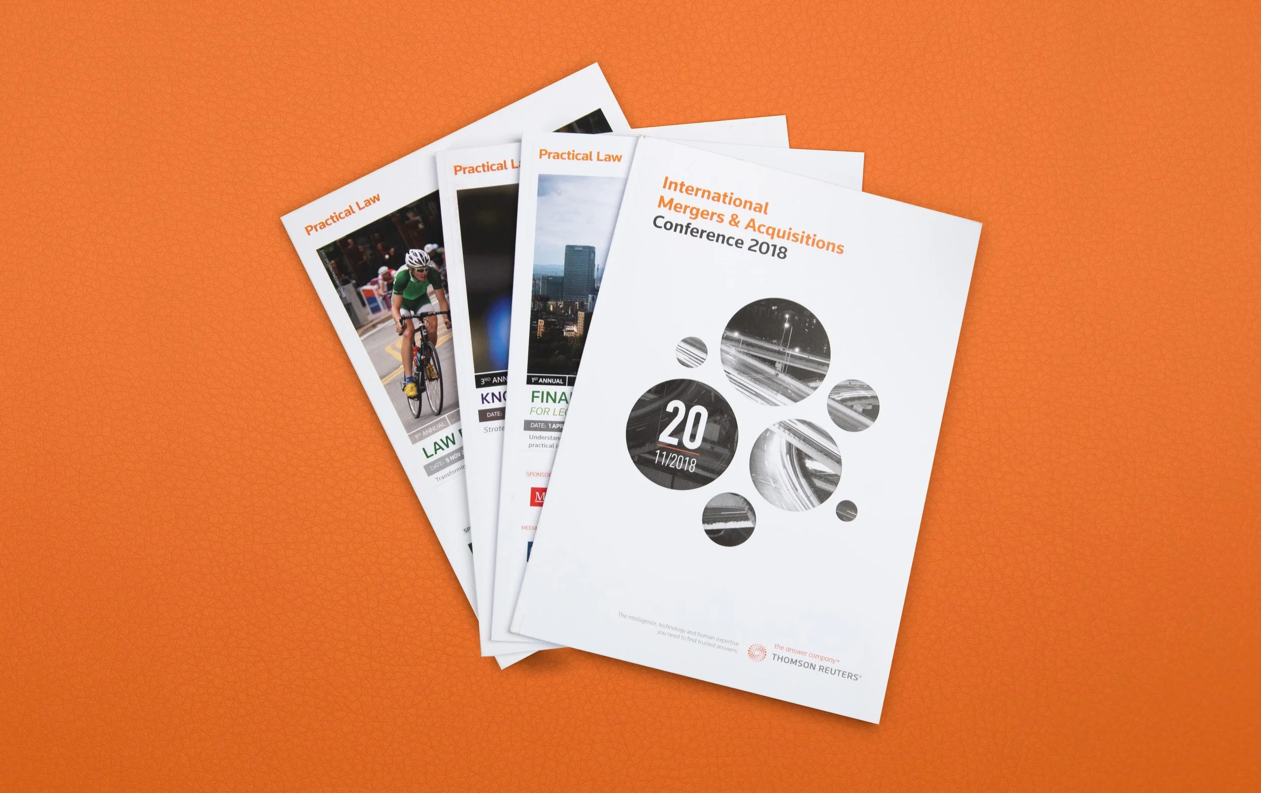 Background: the delegate packs in the image below are among a range of the guides created for delegates attending the Practical Law and Thomson Reuters legal events. These guides were typically artworked by myself to very tight deadlines, in close collaboration with events producers and sales teams and included branded PowerPoint presentations, signage and promotional flyers produced in advance of the event.